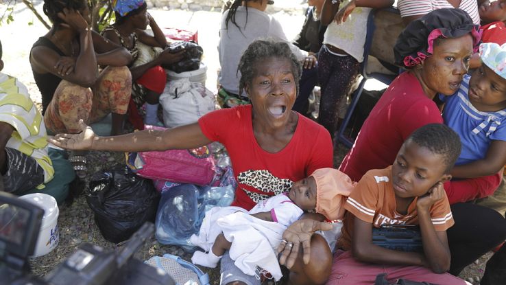 Women and children gather outside a police station after fleeing their homes in Cite –